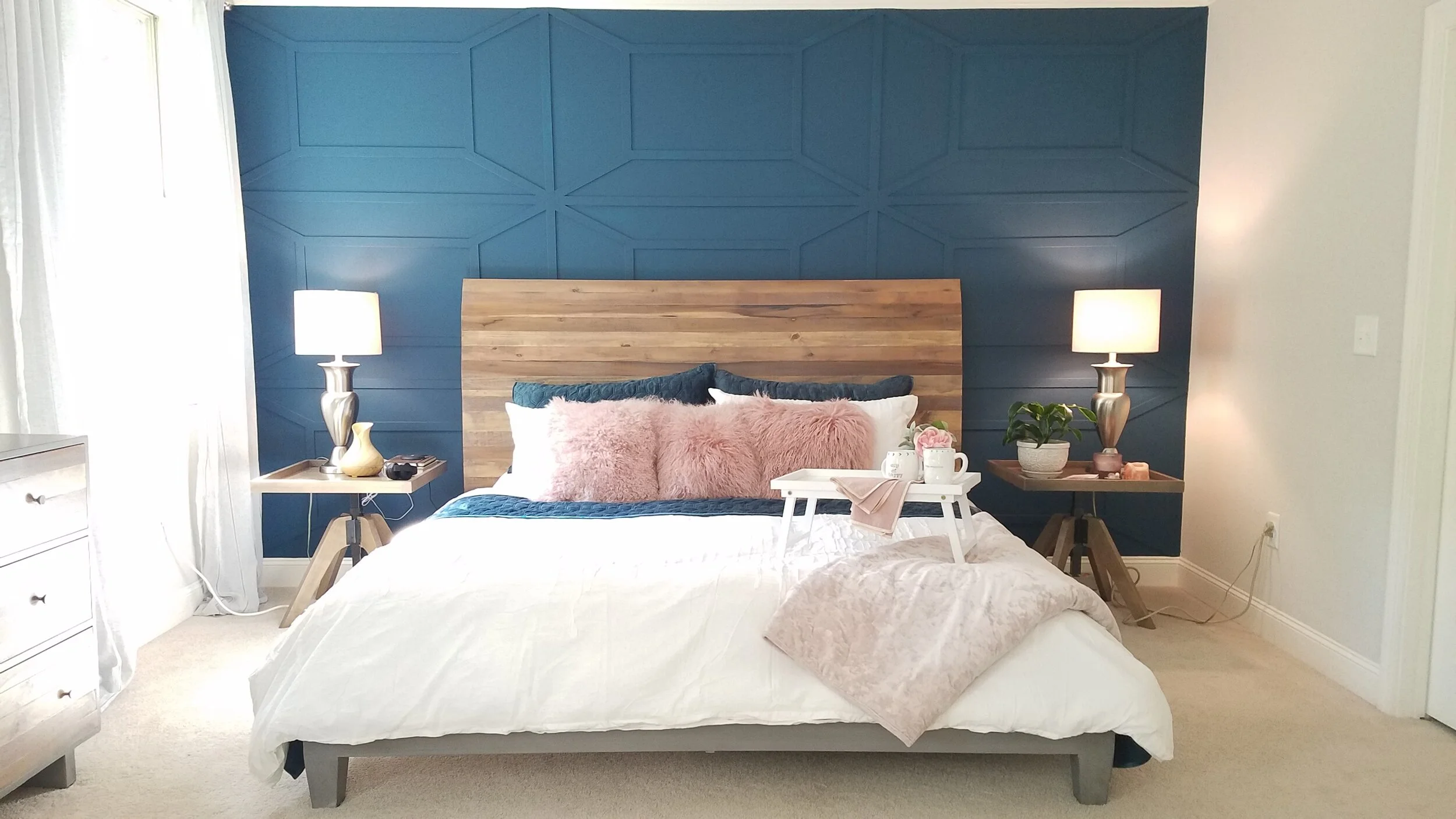 Our clients’ challenge was a very long oversized and under utilized owner‘s suite. They didn’t know how to arrange the furniture to maximize the potential of the space so we came in and not only rearranged the bedroom furniture, but also brought in a beautiful oversized sofa and created a romantic sanctuary for the couple to spend time together watching movies and cuddling. We divided the space into two separate areas while keeping a cohesive feel by incorporating tranquil teal and soft rose into the color palette throughout. We brought life to the space by including natural elements like plants and wood furniture. Our clients love the trees and natural light and feel like they are escaping from city life just by being in their new owner’s sanctuary.
